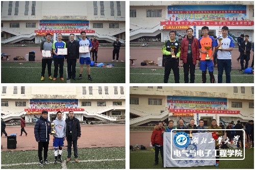 寒冷的天气丝毫没有影响参赛队员的热情,比赛在高昂的湖北工业大学校歌声中拉开序幕。首场进行的是教工队对阵电院广州校友队,双方队员在场上都展现出了顽强的拼搏精神,比赛十分激烈。虽然校友队的0号门将一直鼓励队友加强交流,做好防守,但最终教工队还是以3:1战胜了校友队。第二场比赛为洛奇教育队对阵教工队,教工队依靠着经验和默契,以3:1的比分战胜了洛奇教育队。第三场比赛洛奇教育队和校友队都展现出了精彩的防守和强烈的进攻欲望,但双方都错失了很多攻门的好机会,比赛结束双方0:0握手言和。在随后的点球大战中,广州校友队依靠着门将“凶狠”的扑球和队员们精准的点球取得了胜利。最终教职工队以两战全胜的战绩获得冠军,广州校友队获得了亚军,洛奇教育队获得了季军。随后校党委常委、校长助理鄢烈洲分别给获奖单位和最佳球员颁发了奖杯和证书。