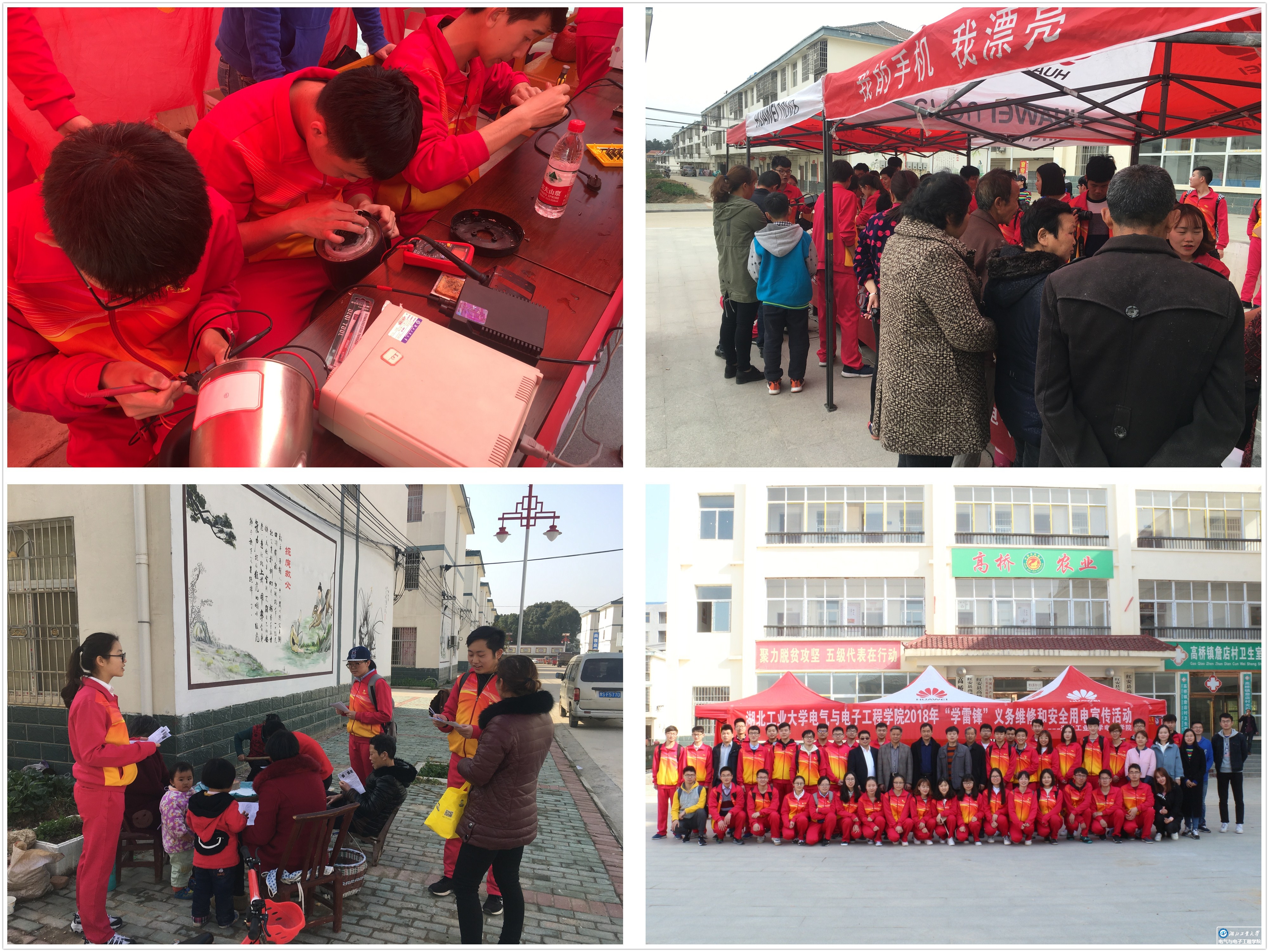所有参加活动人员经过两个多小时的车程到达红安县高桥镇后,“蓝电中心”的同学们在高桥镇行政服务大厅前开始义务维修,他们将理论用于实践,对周围居民送来的老旧家电认真检测,仔细维修,并为行动不便居民提供上门维修服务。大家热心的服务态度和扎实的专业知识获得了当地居民的称赞,也吸引了更多前来维修家电的居民。截止到活动结束,共计修好各类电器70余件。义务维修的同时,安全用电宣传小分队也开始行动。同学们沿着街道挨家挨户宣传安全用电知识,帮助当地居民了解更多的用电小常识,应邀入户检查居民家是否存在安全用电隐患。