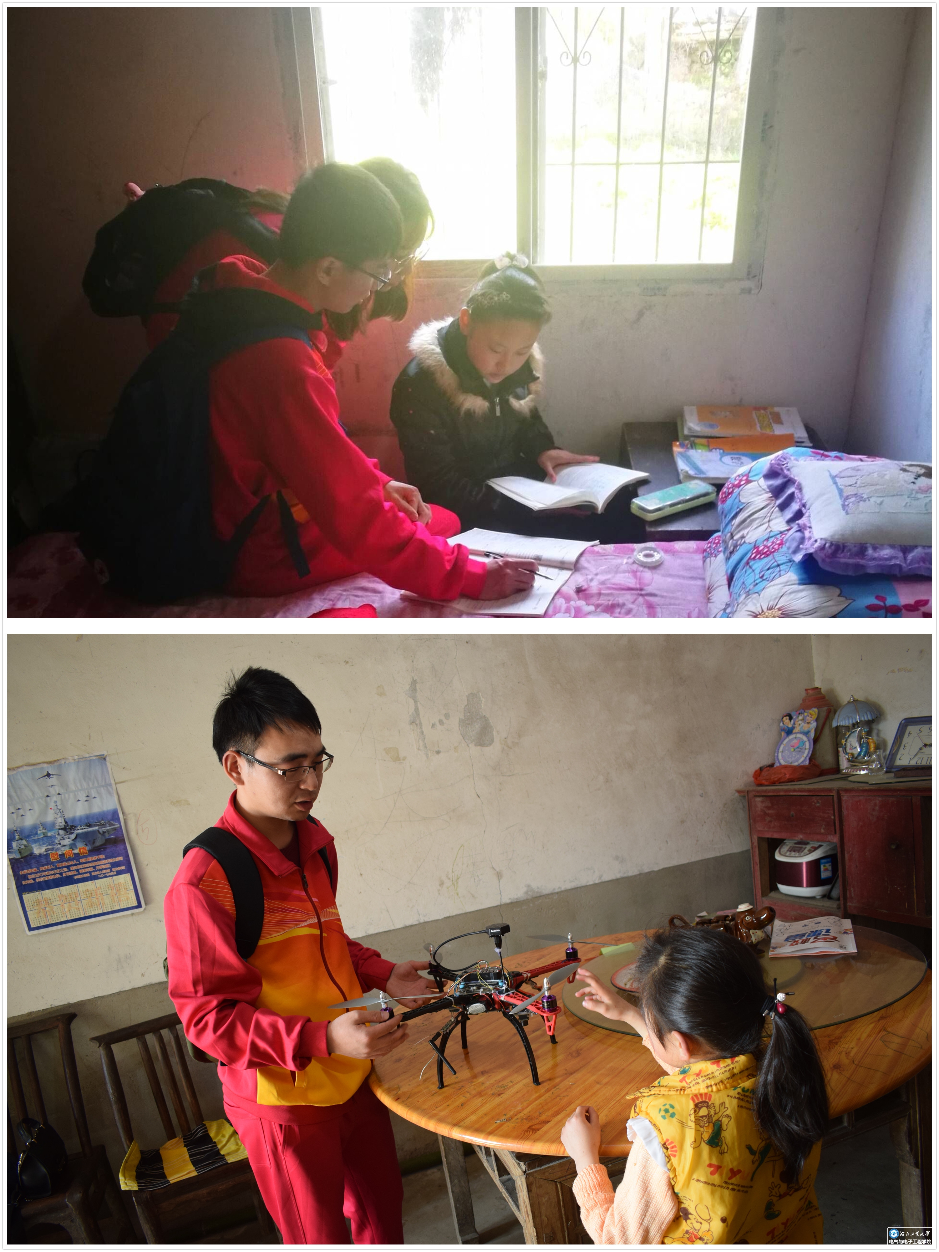 本次活动中部分参加了2017年暑期社会实践的同学们又一次来到高桥镇楼子石村二组吴珂珂和吴欣怡的家里,这姐妹俩是学院“精准扶贫”的对象。同学们给她们做了学习上的辅导,除了解决作业中的疑难,也与她们分享了一些学习方法;“蓝电中心”成员王自强同学还特意带去了自己制作的四轴飞行器,并指导她俩如何操作,在感受科技魅力的同时激励她们克服困难,努力学习。