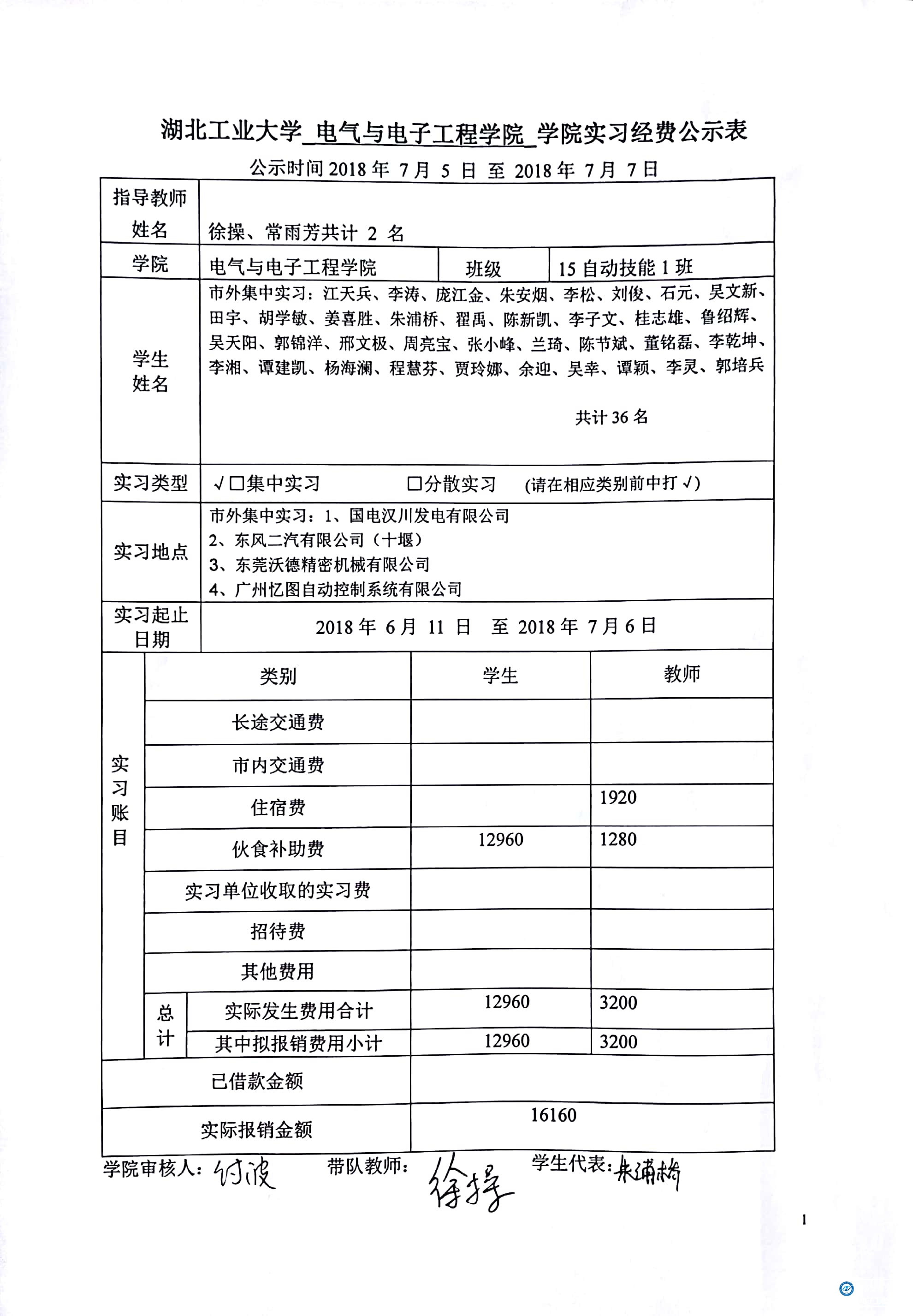 附件:《湖北工业大学电气学院实习经费公示表》2018年7月4日